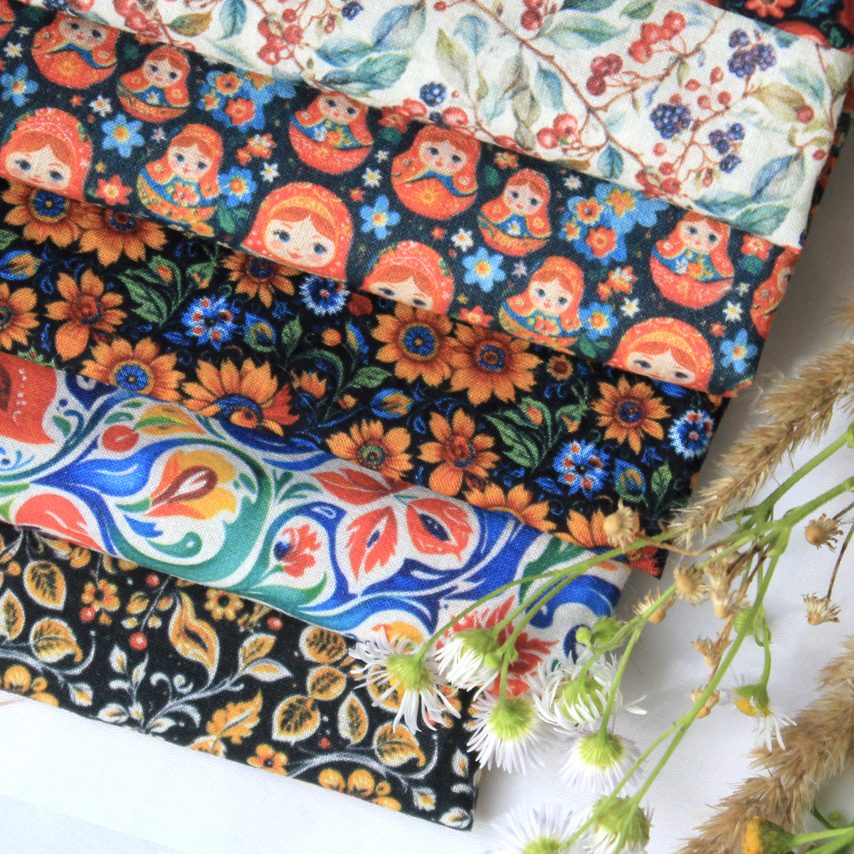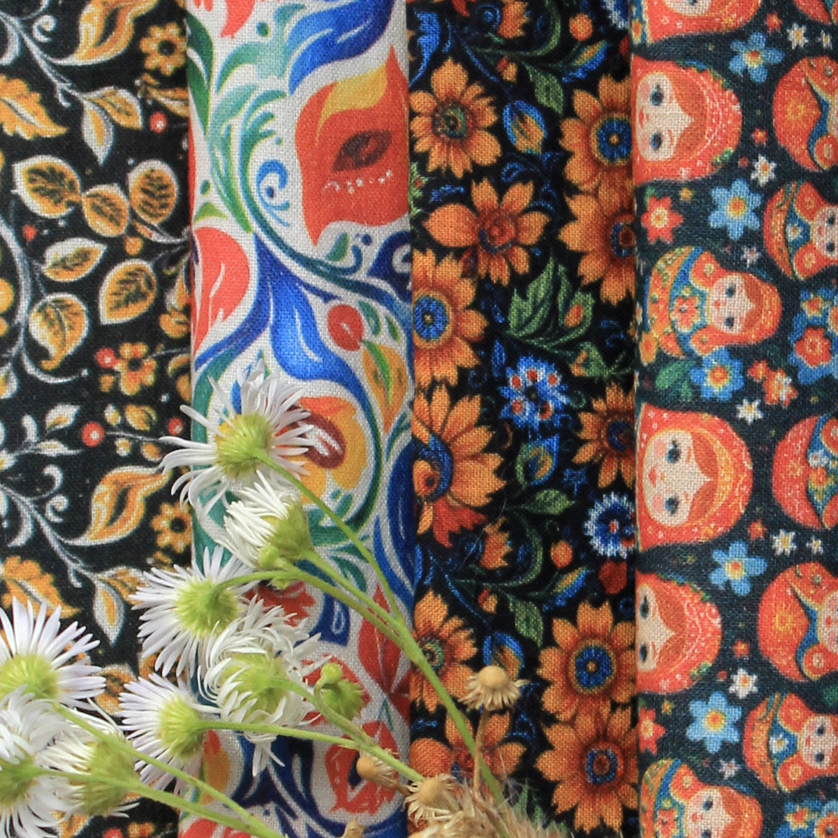 Коллекция "Русский стиль" представлена 6 принтами. Среди них есть матрешки, ягодки, листочки, петушок. Цветовая гамма принтов располагает к созданию образов в русских традициях.