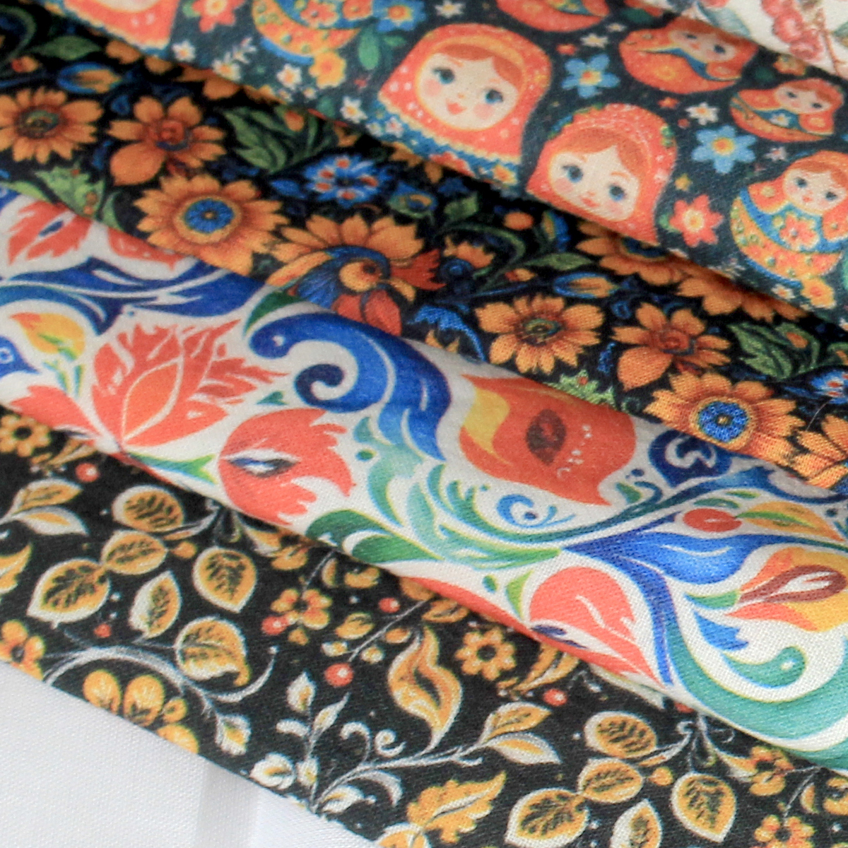 Коллекция "Русский стиль" представлена 6 принтами. Среди них есть матрешки, ягодки, листочки, петушок. Цветовая гамма принтов располагает к созданию образов в русских традициях.