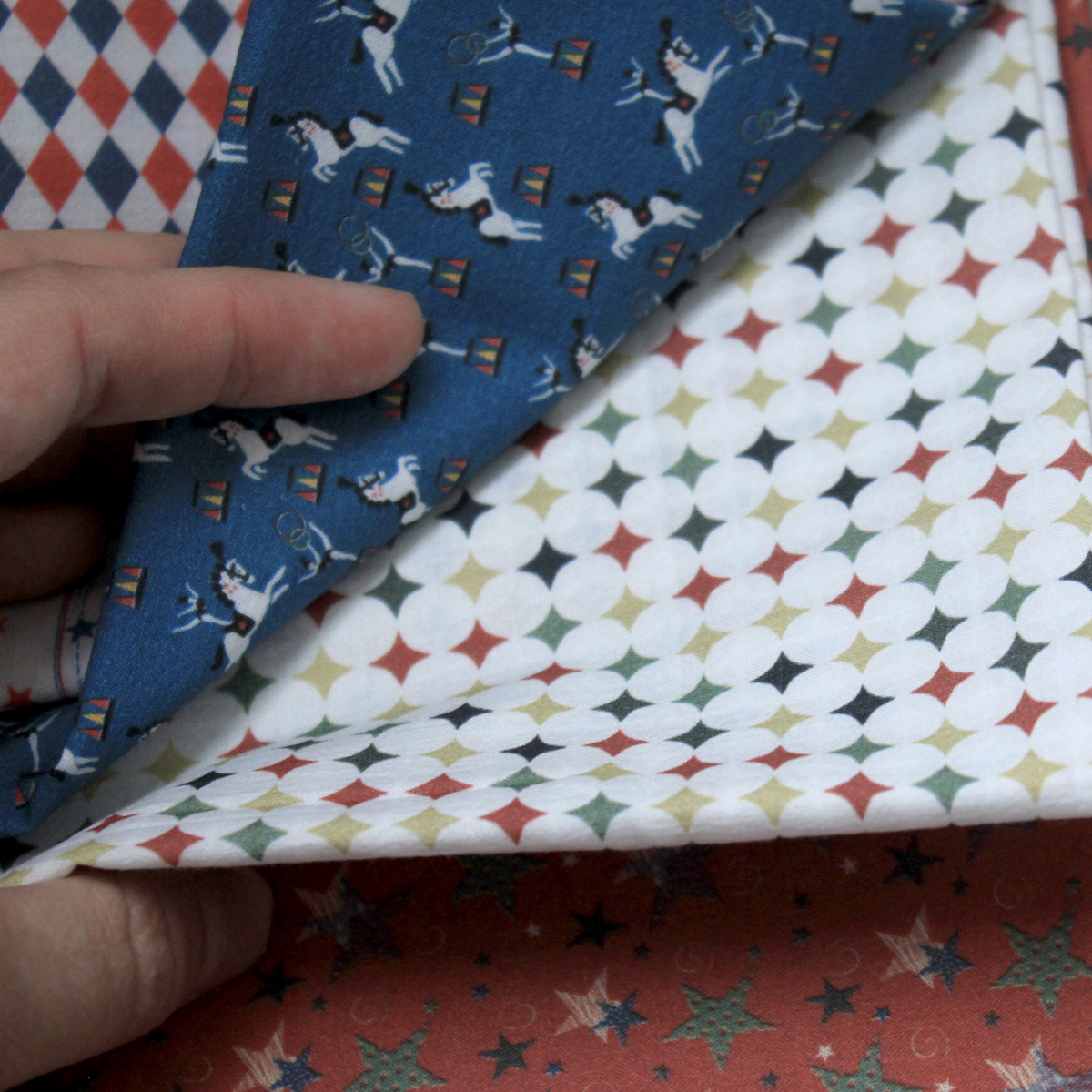 Коллекция "Старый цирк" представлена 9 принтами, cреди которых звездочки, ромбы, цирковые лошадки. Все ткани гармонично сочетаются между собой и имеют приглушенный белый цвет, что создает атмосферу старого цирка. Принты от 0,3-10мм. Отлично подходят для миниатюрных кукол и мишек.